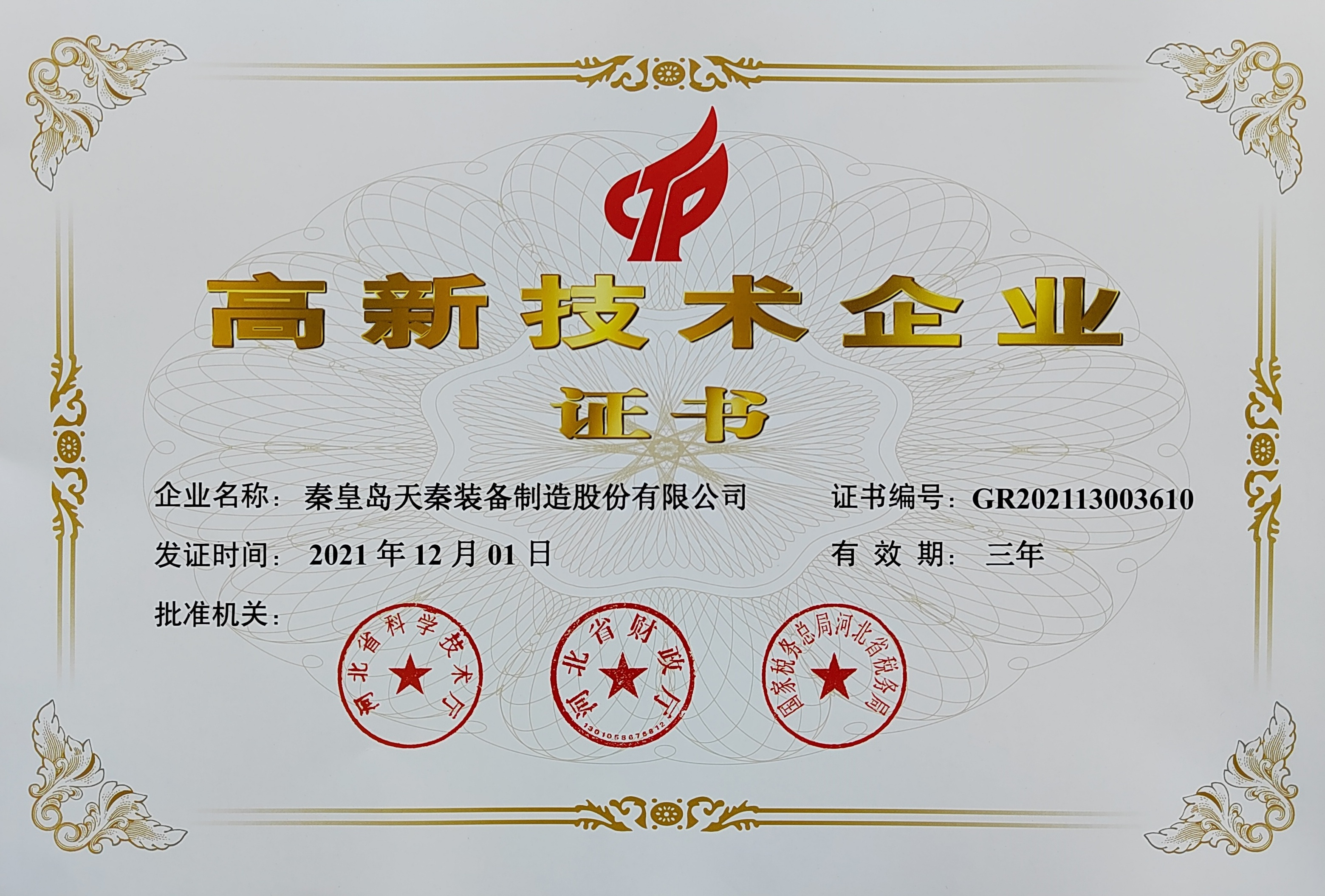 • 秦皇島天秦裝備制造股份有限公司創(chuàng)立于1996年,總部位于河北省秦皇島市經(jīng)濟技術開發(fā)區(qū),秦皇島廠區(qū)占地4萬平方米,擁有3萬平方米的標準廠房、辦公樓和工程技術研發(fā)中心;分部天津廠區(qū)位于天津市靜海經(jīng)濟開發(fā)區(qū),占地2萬平方米,擁有1.6萬平方米標準廠房。 公司通過了GB/T 19001質(zhì)量管理體系及GB/T 24001環(huán)境管理體系認證,是國家高新技術企業(yè)、河北省軍民融合產(chǎn)學研用創(chuàng)建基地,建有省級院士工作站。
